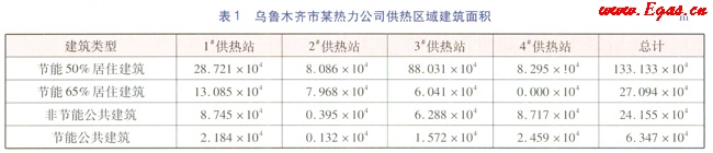 通過走訪、調(diào)研統(tǒng)計(jì)出該熱力公司(下轄4座供熱站)供熱區(qū)域內(nèi)的各類建筑的面積(見表1)。由表1可知,烏魯木齊市某熱力公司總供熱面積為190.729×104m2,其中節(jié)能50%居住建筑面積為133.133×104m2,節(jié)能65%居住建筑面積為27.094×104m2,非節(jié)能公共建筑面積為24.155×104m2,節(jié)能公共建筑面積為6.347×104m2。