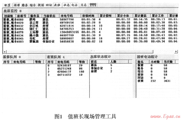 請注意,此處“當前狀態(tài)”顯示的信息正是本文前述“工作狀態(tài)量化考核”中提及的基本內(nèi)容。如果“狀態(tài)”時間超標,對應的“持續(xù)時間”一列數(shù)據(jù)顯示就會變成紅色,提示值班長應予重點關注,必要時進行適當干預,確保服務熱線現(xiàn)場工作有序進行。管理工具的下半部顯示出各技能分組隊列放置情況、當前話務統(tǒng)計數(shù)據(jù)及坐席人員配置現(xiàn)狀。一旦有情況,當班值班長可以根據(jù)隊列狀態(tài)及時調(diào)整相關技能組的人員配置。