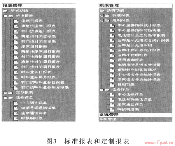 與服務熱線數(shù)字化管理的基本應用工具比較,報表反映的內(nèi)容更全面更系統(tǒng)。尤其體現(xiàn)在熱線定制報表上。它把企業(yè)多年來在傳統(tǒng)數(shù)據(jù)統(tǒng)計匯總報表上積累的經(jīng)驗作了優(yōu)化組合和集中提煉,針對性和效果都很好。圖3截取了報表管理系統(tǒng)中有關報表分類的樹狀結(jié)構(gòu)分布。