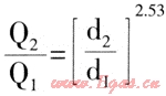 舊有的管網(wǎng)系統(tǒng)中管徑較小的管道有可能是制約管網(wǎng)通過能力的瓶頸。通過管網(wǎng)計算,北京市中壓管網(wǎng)主干線個別管段由于管徑較小,嚴重阻礙了管網(wǎng)輸送,應(yīng)將此管段進行擴徑,如香山南路管線,管徑為DN400。全長4000m。其中有一段DN100,導致附近壓力偏低,若將此段管線改為DN400,附近壓力由0.04MPa,升到0.06MPa。圖5所示為擴大管徑對管輸能力提高倍數(shù)的影響,計算式:
