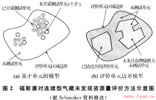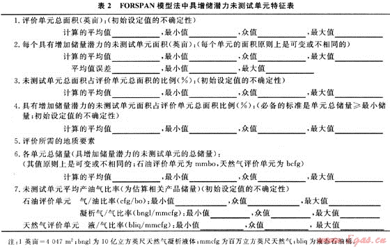 福斯潘模型(FORSPAN)法是USGS在1999年為連續(xù)型油氣藏資源評價而提出的一種評價方法。該方法以連續(xù)型油氣藏的每一個含油氣單位為對象進行資源評價,即假設每個單元都有油氣生產(chǎn)能力,但各單元間汗油氣性(包括經(jīng)濟性)可以相差很大,以概率形式對每個單元的資源潛力作出預測。以往也用體積法對連續(xù)型油氣藏資源潛力作過評價。在體積法中,原始資源量估算常用的參數(shù)主要是一些基本地質參數(shù)(如面積、厚度、孔隙度等),這些參數(shù)有很大的不確定性,且各單元間關系密切、缺乏獨立性。因此,參數(shù)選取及標準確定較困難。福斯潘(FORSPAN)法建立在已有開發(fā)數(shù)據(jù)基礎上(圖2),估算結果為未開發(fā)原始資源量。因此,該方法適合于已開發(fā)單元的剩余資源潛力預測。已有的鉆井資料主要用于儲層參數(shù)(如厚度、含水飽和度、孔隙度、滲透率)的綜合模擬、權重系數(shù)的確定、最終儲量和采收率的估算。如果缺乏足夠的鉆井和生產(chǎn)數(shù)據(jù),評價可依賴各參數(shù)的類比取值。