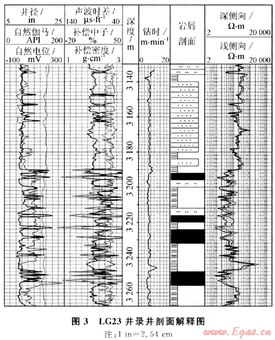 LG23井,試驗(氮?dú)?井段3130.00~3683.00m。該井用自動取樣裝置所取巖樣(每4m取1個樣)建立的錄井剖面,與測井解釋剖面符合率為87%(圖3)。