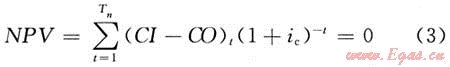 依據技術經濟評價盈虧平衡原理,采用現值法,將投入和產出均折算為評價起始年的累計凈現值(NPV)為零作為極限,基本公式如下:
