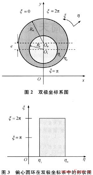 在直角坐標(biāo)系中,偏心圓的幾何形狀是不規(guī)則的,為了使邊界條件簡化,引入雙極坐標(biāo)系;ξ和η為雙極坐標(biāo)系的坐標(biāo)分量,η從-∞到+∞;ξ從0到2π,可以覆蓋全平面;e為偏心距,即兩圓圓心的距離[5~6],如圖2所示。