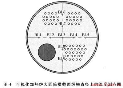為對上述結(jié)論加以驗證,進(jìn)行了大圓筒內(nèi)介質(zhì)流動的可視化流場試驗,試驗?zāi)康氖菍崪y數(shù)據(jù)和觀察到的情況進(jìn)行分析,為加熱爐實物的試驗和實際設(shè)計打基礎(chǔ)。考慮到大圓筒內(nèi)流場分布可能較紊亂,因此采用可視手段,目的是能夠觀察到流場的基本動向。試驗用可視化加熱爐大圓筒外殼由有機(jī)玻璃構(gòu)成,火筒和煙管束由黃銅制成,布置于大圓筒下方,用電加熱器加熱空氣模擬煙氣流入火筒經(jīng)轉(zhuǎn)向室流入煙管束然后排入大氣,電加熱器采用2kW、4kW、6kw的功率,由此形成熱風(fēng)循環(huán)系統(tǒng);大圓筒內(nèi)中間載熱介質(zhì)采用水,因水量較大,為使試驗時介質(zhì)水的溫度能迅速達(dá)到要求,設(shè)計了預(yù)熱水系統(tǒng),即專門配備了預(yù)熱水箱,內(nèi)有電加熱器能較快地加熱介質(zhì)水,使其達(dá)到預(yù)定溫度后再注入大圓筒內(nèi);對流管束受熱面由紫銅管制成,布置于大圓筒上方,對流管束彎成“U”型,一端為進(jìn)口,一端為出口,被加熱流體為空氣,為控制其初始溫度,在冷風(fēng)系統(tǒng)中配有空調(diào)器以降低空氣溫度。為測量大圓筒圓截面上流場的溫度分布,在圓截面的縱軸和橫軸上布置了溫度測點,編號分別為BL1~9,如圖4所示。試驗時同時開啟冷風(fēng)及熱風(fēng)循環(huán)系統(tǒng),并通過預(yù)熱水系統(tǒng)將大圓筒內(nèi)中間載熱介質(zhì)水的溫度控制在41.7℃和63℃,以觀察流場,并測試不同加熱功率對大圓筒內(nèi)水溫的影響。