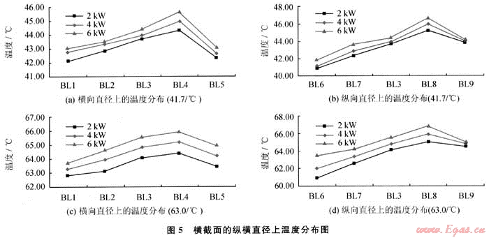 測試結(jié)果由圖5所示,在不同的加熱功率下,橫軸上測點BL4的溫度最高,縱軸上測點BL8的溫度最高,因為這兩個測點離火筒位置最近,而火筒是模擬煙氣的入口,氣流溫度最高,測點BL3至BL4的溫度變化幅度在中間載熱介質(zhì)水溫為41.7℃時比為63℃時大,其原因是介質(zhì)水溫較低時,與火筒內(nèi)的氣流溫差較大,使火筒壁面附近對流換熱加大,介質(zhì)水溫上升快,因此火筒周圍形成了較強(qiáng)的上升流;而介質(zhì)水溫為63℃時,由于介質(zhì)與氣流間的溫差較小,對流換熱相對弱,上升流的動力也小??v軸上各測點溫度顯示:在不同的加熱功率和中間載熱介質(zhì)溫度下,溫度分層現(xiàn)象明顯,測點BL8溫度最高,自BL3、BL7至BL6依次降低,而BL9比BL8低,但高于其他測點,這與流場換熱狀況相吻合;測點BL6的溫度,在加熱功率較小時,會低于介質(zhì)溫度,表明在此附近區(qū)域加熱氣流提供的熱量不足,被加熱氣流只能吸收中間載熱介質(zhì)的初始熱量達(dá)到升溫的目的。試驗結(jié)果證實了數(shù)值計算反映的大圓筒中間載熱介質(zhì)天然氣加熱爐流場中存在的問題。