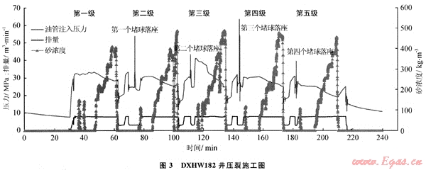 2009年對DX1424井采用小階梯類似線形加砂壓裂,控制前置液比例50%以上,排量確定為4m3/min左右,加砂規(guī)模介于2.0~3.0m3/min,壓裂后日產(chǎn)氣29.0×104m3。