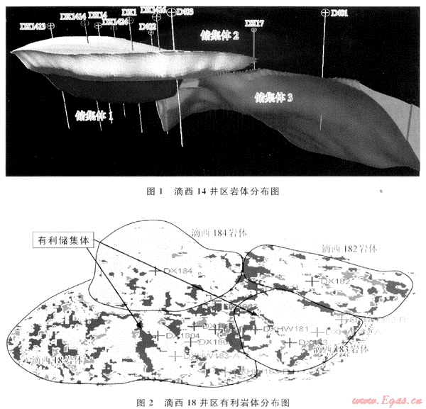滴西14井區(qū)為多錐型復(fù)合火山機(jī)構(gòu),以爆發(fā)相為主,經(jīng)歷多期次噴發(fā)及水流搬運(yùn)沉積,形成3個(gè)火山巖體(圖1),對應(yīng)3個(gè)儲集體,具有“兩弱一強(qiáng)”的地震反射特征,有利儲層為爆發(fā)相的火山角礫巖儲層(儲集體1和儲集體2)。