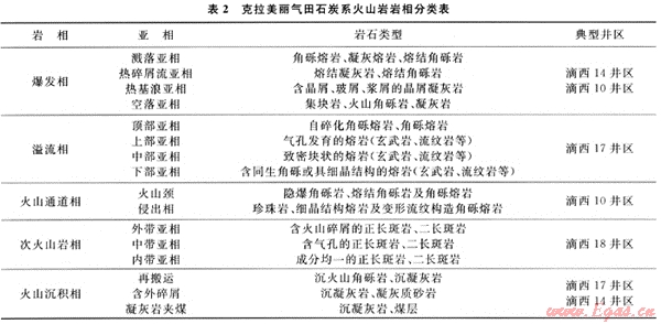 以“形成方式、產(chǎn)出狀態(tài)、產(chǎn)出部位和巖石組合”為依據(jù),建立了石炭系火山巖巖相類型及命名標(biāo)準(zhǔn),劃分出5種巖相、16種亞巖相(見表2)。