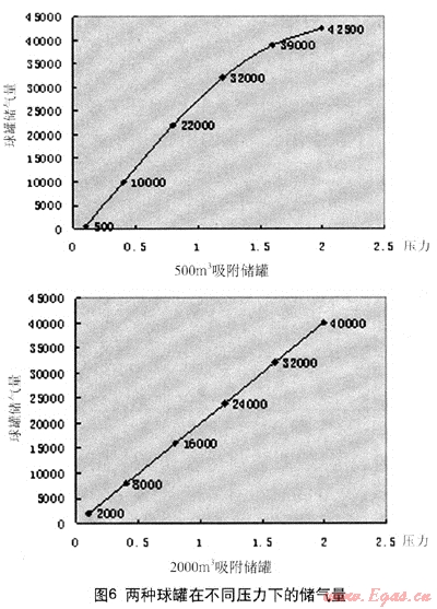 選用高表面活性炭作為吸附劑,在壓力為2MPa時(shí),其有效儲(chǔ)氣量為85v/v,那么一個(gè)500m3的吸附球罐,其可儲(chǔ)存的氣量為500×85=42500m3。在2MPa下,2000m3的壓力球罐與設(shè)計(jì)的吸附球罐作比較,詳見圖6。
