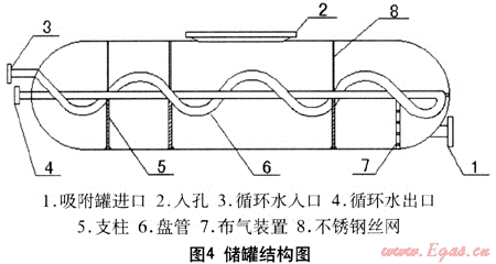 如圖4所示,本項(xiàng)目采用內(nèi)置盤管的天然氣儲(chǔ)罐,盤管內(nèi)采用冷卻水為介質(zhì)。在儲(chǔ)氣時(shí),盤管內(nèi)通入冷卻水,降低吸附劑床層的溫度,提高吸附劑的吸附性能;放氣時(shí),盤管內(nèi)通入熱水,提高吸附劑床層的溫度,提高吸附劑的有效吸附量。