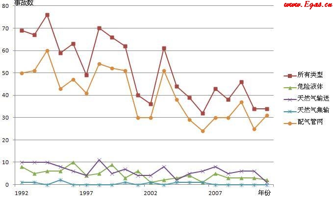 根據(jù)美國PHMSA管道失效數(shù)據(jù)庫統(tǒng)計(jì),管道系統(tǒng)發(fā)生的重特大事故中,約80%是由城鎮(zhèn)燃?xì)夤芫W(wǎng)導(dǎo)致的事故(見圖 1),因此針對城鎮(zhèn)燃?xì)夤芫W(wǎng)開展完整性管理具有重要意義。美國針對DIMP的研究從2000年左右開始。2005年管道和危險材料安全管理局(Pipeline&HazardousMaterialsSafetyAdministration,簡稱PHMSA)、燃?xì)廨斉涔I(yè)協(xié)會和國家管道安全協(xié)會共同發(fā)布了《燃?xì)廨斉涔艿劳暾怨芾?mdash;—第一階段調(diào)研報(bào)告》,此后美國有多家相關(guān)的政府機(jī)構(gòu)、協(xié)會組織和研究機(jī)構(gòu)參與了燃?xì)夤芫W(wǎng)完整性管理的研究工作,并進(jìn)行相關(guān)標(biāo)準(zhǔn)的制定以及完整性管理開展情況的檢查和審查工作。