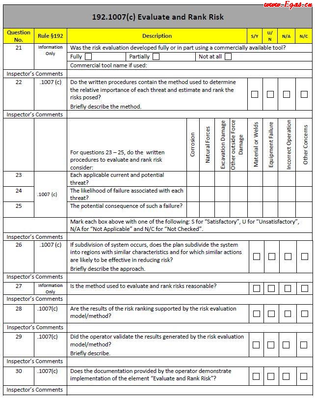 由PHMSA于2011年9月制定和發(fā)布。用于檢查和評價燃?xì)膺\(yùn)營企業(yè)開展完整性管理情況,檢查手冊(示例見圖 5)以表格和提問形式進(jìn)行檢查。對于問題的回答有S/Y、U/N和N/A三種形式,其中S/Y表示是或者滿足條件,U/N表示不是或者不滿足條件,N/A表示標(biāo)準(zhǔn)不適用或者未進(jìn)行檢查。燃?xì)馄髽I(yè)也可利用該檢查手冊進(jìn)行自檢,以完善其完整性管理水平。