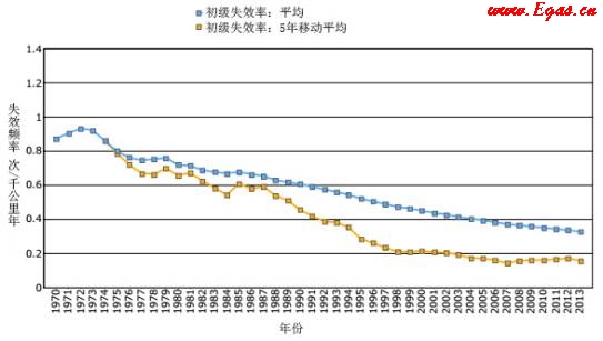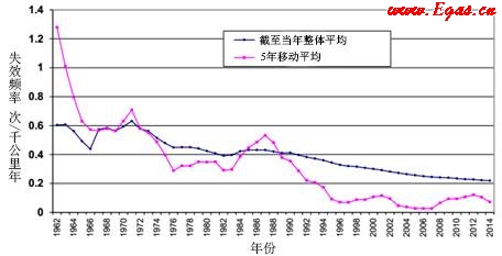 圖13 整體和5年移動(dòng)平均失效頻率(1962-2014年)