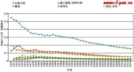 圖9 EGIG管道失效頻率(各因素5年移動(dòng)平均失效率)