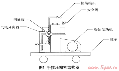 圖1所示的手推式壓縮機(jī)采用活塞式小型壓縮機(jī),動(dòng)力源采用手搖啟動(dòng)式柴油隔爆發(fā)動(dòng)機(jī)。四通閥主要用于改變管路中氣流前進(jìn)方向,從而實(shí)現(xiàn)不拆卸情況下的輸送方向,滿足卸車和氣相回收的功能。壓縮機(jī)出口安裝有安全閥,當(dāng)?shù)构尴掠螇毫^高時(shí)對(duì)壓縮機(jī)設(shè)備進(jìn)行保護(hù)。整個(gè)橇體的進(jìn)出口采用快裝接頭,使設(shè)備在現(xiàn)場(chǎng)的快速安裝成為可能。