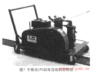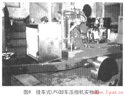 圖7手推式LPG卸車壓縮機(jī)可以實(shí)現(xiàn)在小片區(qū)域的人工改變位置,從而為小片區(qū)域的多個(gè)卸車點(diǎn)進(jìn)行卸車;圖8為掛車式LPG卸車壓縮機(jī),其中配備了更加齊全的附加設(shè)備,從而實(shí)現(xiàn)了大片區(qū)域的不同地點(diǎn)的卸車需求。目前該種移動(dòng)式應(yīng)急卸車設(shè)備在香港加德士石油公司、香港加德士石油公司、香港殼牌有限公司及汕頭加德士海洋燃?xì)庥邢薰九鋫涫褂?,?yīng)該算作是用于搶險(xiǎn)卸車的雛形狀態(tài)。