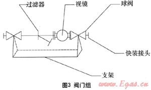圖3所示閥門組主要是將一些液相管路上必須的設(shè)備集成在一個(gè)支架上以滿足進(jìn)行快速的安裝需要。主要包括過濾器、視鏡、球閥、快裝接頭和支架。視鏡主要是用于觀測(cè)液相管路中液相輸送情況,其內(nèi)部自帶止回閥,可防止搶險(xiǎn)槽車中的液相回流至事故槽車。