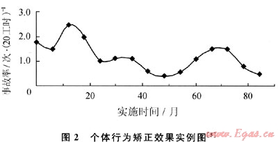 目前,行為科學(xué)在現(xiàn)代安全管理科學(xué)中日益受到重視,研究成果取得有效的收益。實(shí)驗(yàn)表明,在個(gè)體行為矯正方法的實(shí)施過程中,由于員工不安全行為的減少,事故率呈周期性下降趨勢(圖2)[5]。根據(jù)海因里西(Heinrich)事故三角形可知,即使是輕微事故的減少,也會對預(yù)防重大事故的發(fā)生產(chǎn)生重要意義。