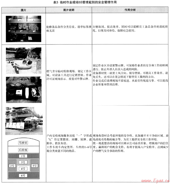 燃?xì)馄髽I(yè)是沒(méi)有“圍墻的工廠(chǎng)”,存在很多臨時(shí)作業(yè)場(chǎng)所。如:井室搶維修作業(yè)、戶(hù)內(nèi)安檢作業(yè)等。相對(duì)來(lái)說(shuō)這些臨時(shí)性作業(yè)場(chǎng)所不穩(wěn)定因素較多,現(xiàn)場(chǎng)的安全控制更加重要。通過(guò)0HSAS18001我們可以識(shí)別了存在的風(fēng)險(xiǎn)、制定了安全措施和作業(yè)管理流程、以及應(yīng)急預(yù)案等,如果和5S現(xiàn)場(chǎng)定置管理結(jié)合起來(lái),可以取得更好的成效。見(jiàn)表3: