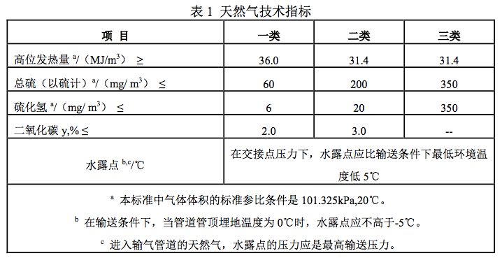 GB50028《城鎮(zhèn)燃氣設計規(guī)范》2006中對天然氣的質(zhì)量進行了規(guī)定:天然氣發(fā)熱量、總硫和硫化氫含量、水露點指標應符合現(xiàn)行國家標準《天然氣》GB17820的一類氣或者二類氣的規(guī)定。