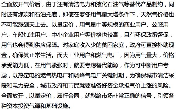 全面放開,以量定價。任何商品都是零售價格高,批發(fā)價格低,買的越多就應該折扣越多,價格越便宜。天然氣價格改革全面放開,以量定價也應該符合基本市場原則,也符合壓力和壓強的關系,天然氣大工業(yè)用戶或大型燃氣電廠由于用氣量大,同等天然氣價格波動產(chǎn)生的壓力對其成本和贏利能力形成的壓強巨大,需求彈性大;而居民用氣量小,用戶多且分散,同等天然氣價格波動產(chǎn)生的壓力對其使用形成的壓強較小,需求彈性小。燃氣供應商在滿足居民、商業(yè)、公服、車船加注等眾多分散用戶,要投入更多人力、物力和財力,其成本要遠遠大于穩(wěn)定生產(chǎn)的大工業(yè)用戶或燃氣電廠。按照以量定價原則,居民用氣應該價格最高,而目前價格體系正好相反,這就是冬天燃氣商為獲得利潤,優(yōu)先滿足高價用戶需求,造成居民用氣氣荒的根本原因。