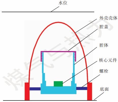 如圖2所示,防水透氣殼的外殼殼體采用橢球狀設(shè)計(jì),腔體高度大于外殼殼體高度的1/2。當(dāng)水位沒過裝置底面達(dá)10 m時,防水透氣殼內(nèi)部氣體體積大約被壓縮到原體積的1/2,裝置的外殼殼體采用半橢球形設(shè)計(jì),因此,此時外殼殼體內(nèi)水面在外殼殼體高度的1/2位置以下。本裝置腔體的設(shè)計(jì)高度大于外殼殼體高度的1/2,因此,防水透氣殼內(nèi)的水面位置在腔蓋以下,可以防止液態(tài)水進(jìn)入腔體內(nèi)??梢姡词乖谒粵]過裝置底面達(dá)10 m的惡劣條件下,該裝置仍能夠?qū)η惑w內(nèi)的核心元件起到很好的保護(hù)作用。
