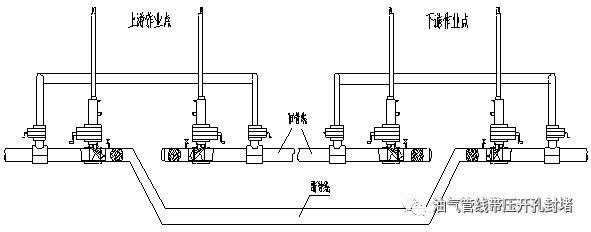 本次改造施工采用四封四堵不停輸封堵工藝,該種工藝優(yōu)點在于:所有工序均在不影響管線內(nèi)介質(zhì)正常輸送的狀態(tài)下進行且減少了長距離鋪設(shè)旁通管線的工作量,縮短了施工周期,使工作進行的井然有序,安全可靠。