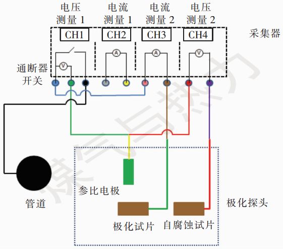 數(shù)據(jù)采集平臺(tái)由智能陰極保護(hù)數(shù)據(jù)采集器及極化探頭兩部分組成,數(shù)據(jù)采集平臺(tái)接線方式見(jiàn)圖1(圖中CH1及CH4為電壓信號(hào)處理模塊,CH2及CH3為電流信號(hào)處理模塊)。