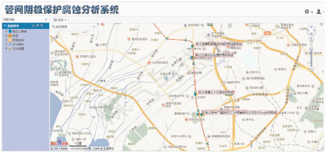 用戶通過(guò)終端軟件輸入用戶名和密碼即可登錄管網(wǎng)陰極保護(hù)腐蝕分析系統(tǒng)軟件。系統(tǒng)終端軟件首頁(yè)界面見(jiàn)圖2。系統(tǒng)以地圖平臺(tái)為界面,實(shí)現(xiàn)監(jiān)測(cè)點(diǎn)地理位置信息展示,從該界面可直觀看出管道的走向路由及與地鐵線路的位置關(guān)系。界面左側(cè)提供報(bào)警、數(shù)據(jù)查詢、數(shù)據(jù)分析評(píng)估查詢及現(xiàn)場(chǎng)設(shè)備點(diǎn)后臺(tái)管理的入口。