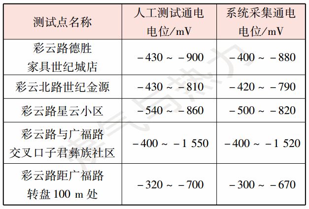 由表1 可以看出,人工測(cè)試通電電位與系統(tǒng)采集通電電位趨勢(shì)一致,但由于系統(tǒng)測(cè)試的結(jié)果中去除了IR降,相比于人工測(cè)試結(jié)果偏正,更為精確。