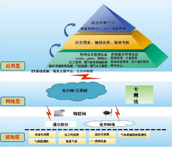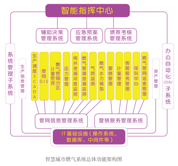 智慧城市燃?xì)庀到y(tǒng)主要由十大應(yīng)用系統(tǒng)共21個子系統(tǒng)組成,即生產(chǎn)領(lǐng)域的管網(wǎng)信息管理系統(tǒng);服務(wù)領(lǐng)域的營銷服務(wù)管理系統(tǒng);領(lǐng)導(dǎo)決策支持的應(yīng)急預(yù)案管理系統(tǒng)、輔助決策管理系統(tǒng)、績效考核管理系統(tǒng);統(tǒng)一指揮調(diào)度的智能指揮中心系統(tǒng);自動化辦公的OA系統(tǒng)和系統(tǒng)管理支撐子系統(tǒng)。