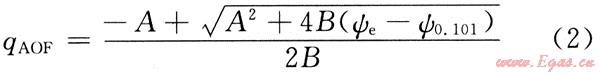 根據(jù)(ψe-ψwf)/qg-qg的直線關(guān)系處理產(chǎn)能測試數(shù)據(jù),得到方程系數(shù)A與B,無阻流量的計算公式為: