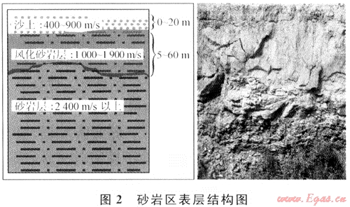 該區(qū)地表巖性復雜,表層結(jié)構(gòu)縱、橫向變化較大(見圖2)。在堿灘堿湖、沙漠區(qū)用小折射方法,砂巖出露區(qū)用微測井方法進行表層調(diào)查。