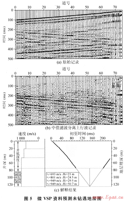 圖5-a是該區(qū)采集的微VSP野外原始記錄,利用中值濾波進行波場分離,分離后的上行波記錄如圖5-b所示,該波場分離方法能較好地分離出上行波。圖5-c是該軟件解釋結(jié)果,得到低降速帶深度或高速度層頂界深度為125m,井底至高速層頂50m。