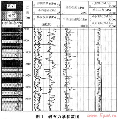 地層的孔隙壓力、體積模量、楊式模量、單軸抗壓強(qiáng)度、最小水平主應(yīng)力方向等參數(shù)是出砂預(yù)測的重要參數(shù)。這些參數(shù)均可在實(shí)驗(yàn)室和氣井生產(chǎn)過程得到,但得出的數(shù)據(jù)是離散的且成本較高。目前已經(jīng)有成熟的利用測井方法求散巖石力學(xué)參數(shù)的方法[1],筆者采用Schlumberger公司的STARS軟件,以縱波時(shí)差、橫波時(shí)差、補(bǔ)償密度、泥質(zhì)含量和地層孔隙度為輸入曲線,求取巖石的彈性模量和巖石強(qiáng)度。圖1為計(jì)算得到的地層的巖石力學(xué)參數(shù),這些參數(shù)將用于出砂預(yù)測。