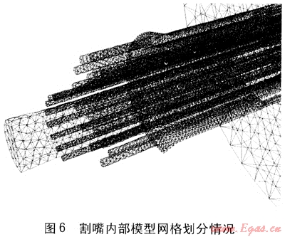 本文應(yīng)用CFD軟件對割嘴內(nèi)外圈氧氣與丙烷的流動和燃燒做了冷態(tài)、熱態(tài)模擬。模擬計算的模型包括割嘴內(nèi)部氣體流場和割嘴外部空間氣體流場兩部分,因為割嘴是中心對稱的,所以只模擬整個割嘴的一半??傮w幾何模型見圖3,其中割嘴外部空間是直徑為200mm,長度為1600mm的半圓柱體。割嘴內(nèi)部模型見圖4,包括高壓切割氧孔道、內(nèi)外圈預(yù)熱氧孔道、燃?xì)饪椎?。三維網(wǎng)格劃分情況見圖5、6,其中圖6是圖5的局部放大圖。