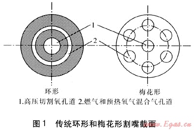 氧氣在切割中主要有兩個作用:①作預(yù)熱火焰的助燃?xì)怏w,這部分氧氣稱為預(yù)熱氧;②使金屬燃燒并將燃燒生成的熔渣排除,這部分氧氣稱為高壓切割氧。傳統(tǒng)切割用割炬的割嘴形式主要有環(huán)形和梅花形兩種[1]。環(huán)形割嘴主要由內(nèi)嘴和外嘴兩部分組合而成,又稱組合式割嘴。梅花形割嘴與環(huán)形不同,燃?xì)夂皖A(yù)熱氧的混合氣孔道呈小圓孔,均勻地分布在高壓切割氧孔道周圍,整個割嘴為一體,又稱整體式割嘴。傳統(tǒng)環(huán)形和梅花形割嘴截面見圖1。
