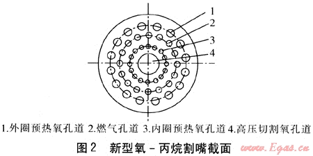 由于不同燃?xì)饩哂胁煌男再|(zhì),若在原來的氧-乙炔割嘴上直接使用丙烷來進(jìn)行氣割,就會有火焰分散無力、氣割速度緩慢、點火困難、不易調(diào)節(jié)的缺點。因此必須設(shè)計專用的氧-丙烷氣割割嘴才能滿足氣割要求。丙烷的熱值比乙炔高,丙烷的燃燒溫度比乙炔的燃燒溫度低。需要重新調(diào)整可燃?xì)怏w與氧氣的比例,降低丙烷-氧氣混合氣體的噴出速度,才能保證良好的燃燒。