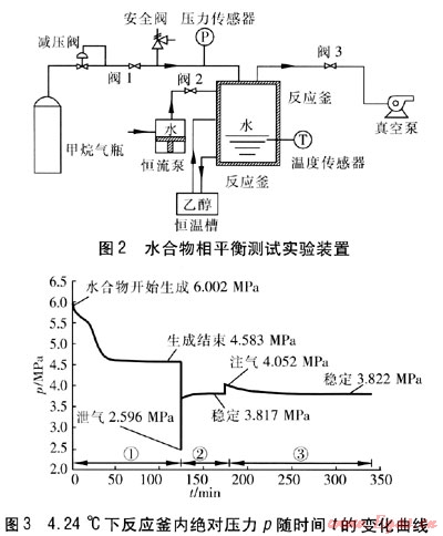 在恒定的反應(yīng)釜容積下,保持實驗溫度不變,使水過量,充入甲烷,使反應(yīng)釜內(nèi)初始壓力高于實驗溫度所對應(yīng)的平衡壓力。當(dāng)有水合物生成,且反應(yīng)釜內(nèi)壓力不再下降時,穩(wěn)定1~3h之后,將反應(yīng)釜內(nèi)壓力泄至實驗溫度對應(yīng)的平衡壓力以下,此時水合物大量分解,壓力開始上升。當(dāng)壓力不再上升時,穩(wěn)定1~3h,再充入甲烷,升壓至實驗溫度對應(yīng)的平衡壓力以上,使水合物再次生成。如此反復(fù)幾次,取其值最接近的升壓后的壓力值和降壓后的壓力值的平均值,作為該溫度下的水合物相平衡壓力值。