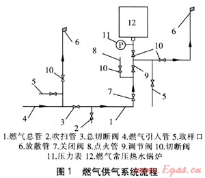 燃?xì)夤庀到y(tǒng)流程見圖1。燃?xì)夤艿涝谕V惯\(yùn)行進(jìn)行檢修時(shí),為檢修工作安全,需要管道內(nèi)的燃?xì)獯祾吒蓛?。系統(tǒng)在較長時(shí)間停止工作后再投入運(yùn)行前,也需要進(jìn)行吹掃。因此,在鍋爐房供氣系統(tǒng)設(shè)計(jì)中,應(yīng)設(shè)置吹掃和放散管道。放散管出口應(yīng)高出屋脊2m以上。由鍋爐房外部引入的燃?xì)饪偣埽谶M(jìn)口處應(yīng)裝設(shè)燃?xì)饪偳袛嚅y,按燃?xì)饬鲃拥姆较颍y前應(yīng)裝放散管,并在放散管上裝設(shè)取樣口,閥后應(yīng)裝吹掃管。為保證鍋爐安全可靠運(yùn)行,要求供氣管和其他管道上安裝的附件連接嚴(yán)密可靠,能承受最高使用壓力,且不得裝設(shè)在高溫和有危險(xiǎn)的地方[3、4]。