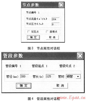 定義以管道為中心線且平行于管道的小面積矩形為線捕捉區(qū)域,以節(jié)點為圓心的小面積圓形為點捕捉區(qū)域,鼠標在上述區(qū)域內(nèi)雙擊會分別彈出節(jié)點屬性和管段屬性對話框帕J,見圖3、4,為相應(yīng)的節(jié)點輸入流量或壓力,為相應(yīng)的管段輸入管長、管徑、管材。對于多氣源管網(wǎng)還需輸入氣源屬性,程序通過節(jié)點編號重排使得壓力基準點編號最大,定壓點隨基準點居后編排,便于節(jié)點方程組的求解。點捕捉和線捕捉技術(shù)實現(xiàn)了管網(wǎng)圖和數(shù)據(jù)的緊密結(jié)合,更加直觀、形象,輸入大量管段和節(jié)點參數(shù)時,很大程度上減少了輸入的差錯,提高了效率。