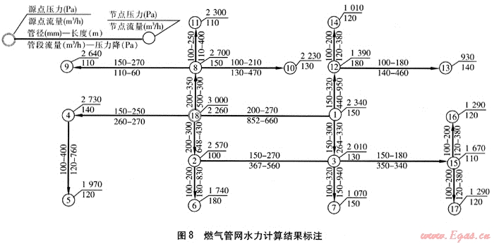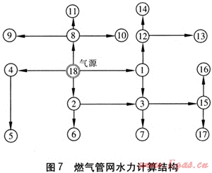 圖7為燃氣管網(wǎng)水力計算結(jié)構(gòu),進行水力計算后在Auto CAD中自動輸出的水力計算結(jié)果標注圖見圖8。
