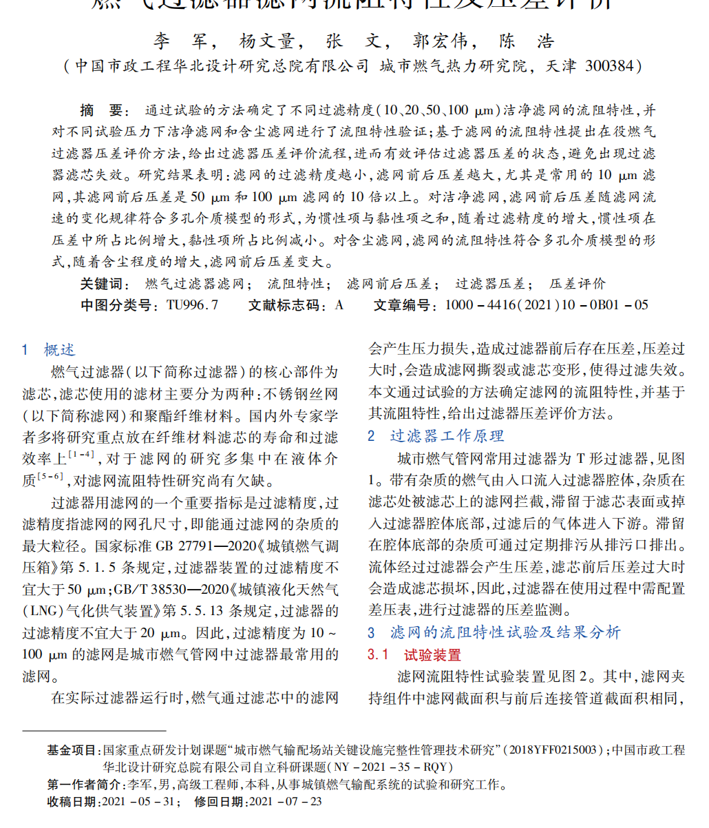通過(guò)試驗(yàn)的方法確定了不同過(guò)濾精度(10、20 、50、 100 um)潔凈濾網(wǎng)的流阻特性,并對(duì)不同試驗(yàn)壓力下潔凈濾網(wǎng)和含塵濾網(wǎng)進(jìn)行了流阻特性驗(yàn)證;基于濾網(wǎng)的流阻特性提出在役燃?xì)膺^(guò)濾器壓差評(píng)價(jià)方法,給出過(guò)濾器壓差評(píng)價(jià)流程,進(jìn)而有效評(píng)估過(guò)濾器壓差的狀態(tài),避免出現(xiàn)過(guò)濾器濾芯失效。研究結(jié)果表明:濾網(wǎng)的過(guò)濾精度越小,濾網(wǎng)前后壓差越大,尤其是常用的10 um濾網(wǎng),其濾網(wǎng)前后壓差是50 um和 100 um濾網(wǎng)的10倍以上。對(duì)潔凈濾網(wǎng),濾網(wǎng)前后壓差隨濾網(wǎng)流速的變化規(guī)律符合多孔介質(zhì)模型的形式,為慣性項(xiàng)與黏性項(xiàng)之和,隨著過(guò)濾精度的增大,慣性項(xiàng)在壓差中所占比例增大,黏性項(xiàng)所占比例減小。對(duì)含塵濾網(wǎng),濾網(wǎng)的流阻特性符合多孔介質(zhì)模型的形式,隨著含塵程度的增大,濾網(wǎng)前后壓差變大。