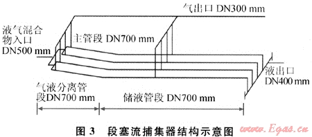 4) 以O(shè)LGA軟件的計算結(jié)果為依據(jù),根據(jù)本工程的實際情況和國際上的經(jīng)驗,采用指狀管式段塞流捕集器,應(yīng)用國際先進的計算方法,確定段塞流捕集器的結(jié)構(gòu)與尺寸并自行進行機械設(shè)計[1]。指狀管段塞流捕集器主要由4根口徑為DN700mm、長度為70m的并聯(lián)管道構(gòu)成(圖3),可捕集的混輸干線最大液塞長度為500m。