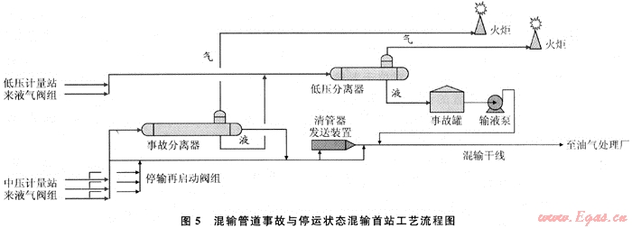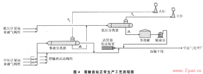 5) 在混輸首站,采用可隨時快速將油井產(chǎn)物的中壓氣液混輸流程轉(zhuǎn)換為中、低壓二級氣液分離流程的事故分離器過流運行工藝,其工藝流程詳見圖4、5。