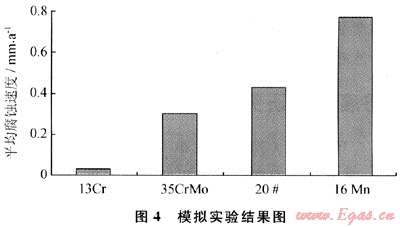 雅克拉氣田、大澇壩氣田管道材料為16Mn、20號(hào)鋼,材料耐蝕性能差。在模擬雅克拉氣田介質(zhì)條件下,對(duì)20號(hào)鋼、16Mn等4種材料進(jìn)行了實(shí)驗(yàn)評(píng)價(jià),實(shí)驗(yàn)結(jié)果見(jiàn)圖4[7]。