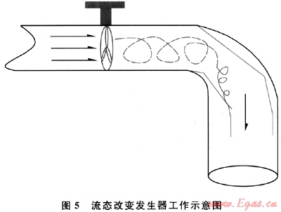 2) 可考慮在彎管前增加流體流態(tài)改變發(fā)生器。由圖2可知,在彎管內(nèi)壁外側(cè)后段和內(nèi)壁內(nèi)側(cè)前段易形成湍流,產(chǎn)生空泡腐蝕。因此,可在流體進(jìn)入彎管前增加一個(gè)流體流態(tài)改變裝置,預(yù)先給流體增加一個(gè)反向旋渦,避免在彎管處產(chǎn)生強(qiáng)烈的渦流,減緩腐蝕,工作原理見(jiàn)圖5。