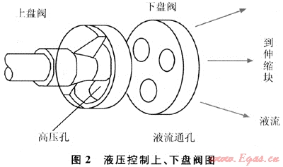 調制式旋轉導向鉆井工具(MRST)屬于推靠式旋轉導向鉆井工具(圖1)。由于其鉆柱與井壁之間不存在靜止點,因此,在鉆井過程中更可體現(xiàn)旋轉鉆井的優(yōu)越性[1]。調制式旋轉導向鉆井系統(tǒng)導向力的大小和方向主要是由穩(wěn)定平臺控制的。當需要最大導向力時,穩(wěn)定平臺控制軸就帶動上盤閥旋轉,使上盤閥穩(wěn)定在預定方向,控制上盤閥高壓孔方向恒定。在鉆柱旋轉過程中,每個“巴掌”依次在該方向附近伸出拍打井壁,導向機構對井壁的作用力就是這些拍打力的合力。這個合力的反力就是鉆柱受到的導向力,方向沿著上盤閥預定方向的反方向。當不需要導向時,穩(wěn)定平臺帶動上盤閥以和鉆柱具有不同的某一轉速勻速轉動,這時“巴掌”均勻拍打井壁四周,導向工具可控制的液壓導向力的合力就等于零,此時導向工具呈中性工作狀態(tài),達到穩(wěn)斜效果。MRST液壓控制閥采用上、下盤閥結構,上盤閥與穩(wěn)定平臺控制軸相連接,它只有一個弧形長孔形狀的高壓閥孔。下盤閥與鉆柱本體連接,隨MRST外殼及鉆柱一起旋轉,它有3個互成120°圓心角的等直徑低壓孔(泄流孔),見圖2。