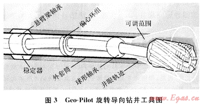 Geo-Pilot[2~3]是一種不旋轉套式導向工具(圖3),屬于指向式旋轉導向鉆井工具。它不是靠偏心穩(wěn)定器的翼肋推靠井壁偏置鉆頭進行導向,而是靠不旋轉套與萬向短節(jié)之間的一套偏心機構使萬向軸偏置,從而為鉆頭提供了一個與井眼軸線不一致的傾角,產生導向作用。該機構由幾個可控制的偏心環(huán)組合而成,當井下自動控制完成偏心環(huán)組合之后,該機構將相對于不旋轉套固定,從而始終將萬向軸向固定方向偏置,為鉆頭提供一個方向固定的傾角。